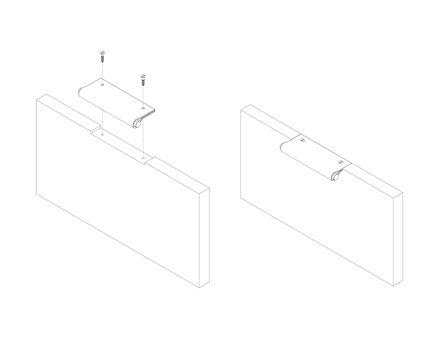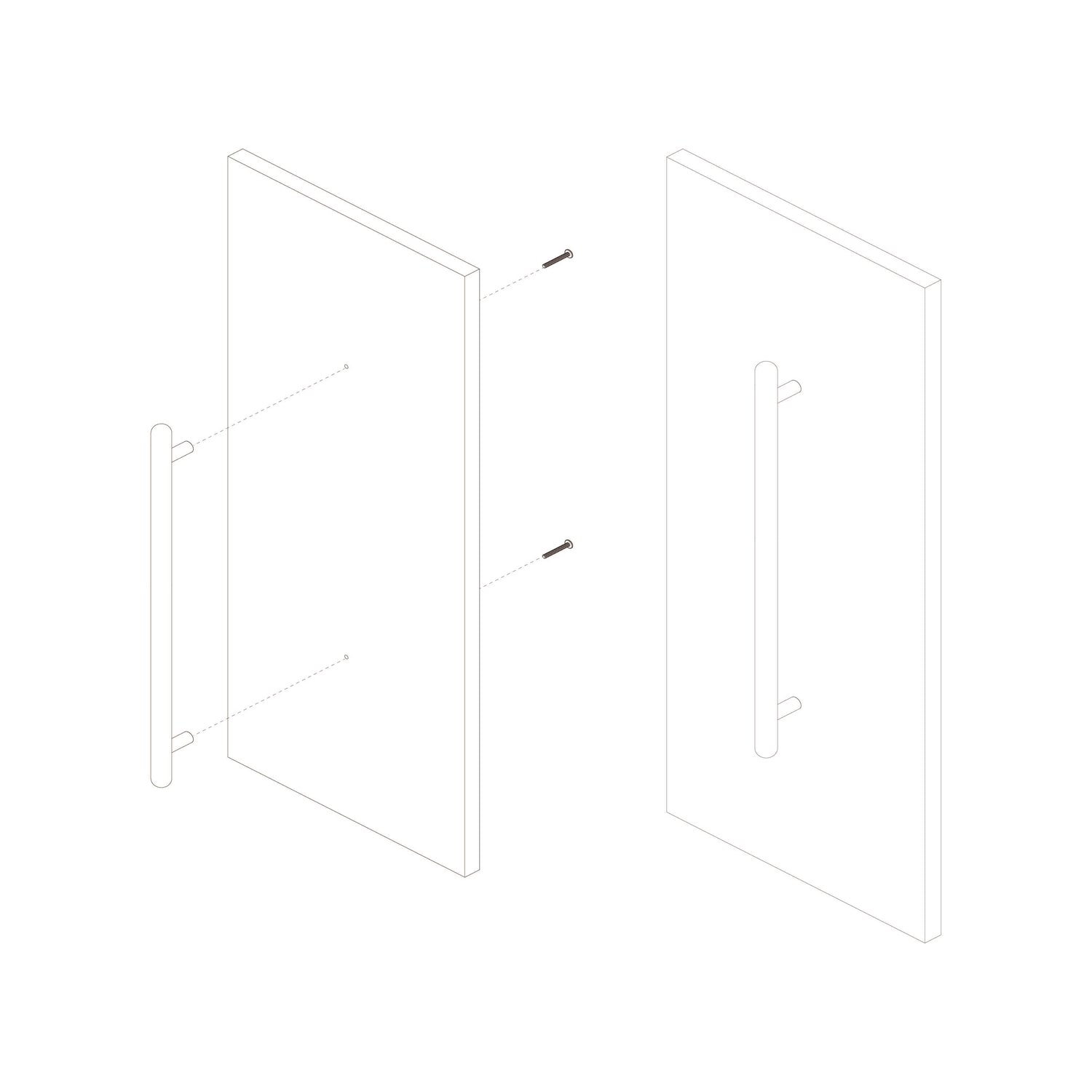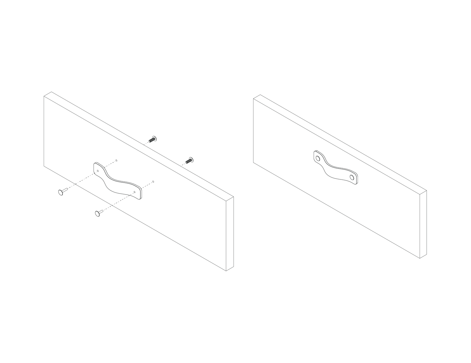 Handles are supplied with pre-cut fixing holes. Fastening screws are supplied. For best results, handles should first be installed with a standard #6 square head screw prior to installing the slotted screws provided.